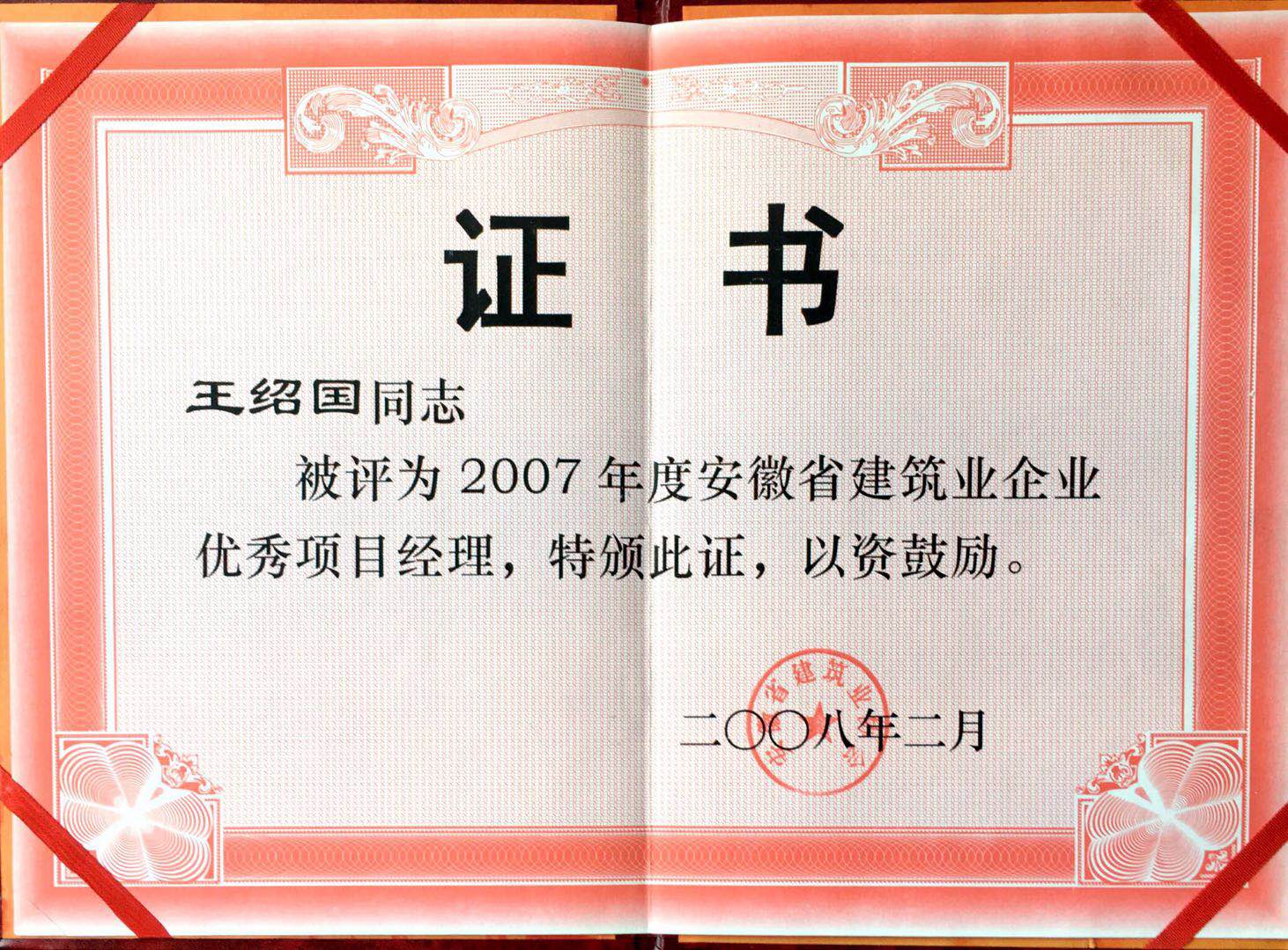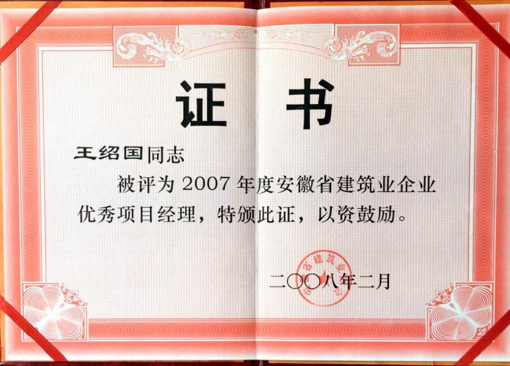 2007年度安徽省建筑業(yè)優(yōu)秀項目經(jīng)理王紹國