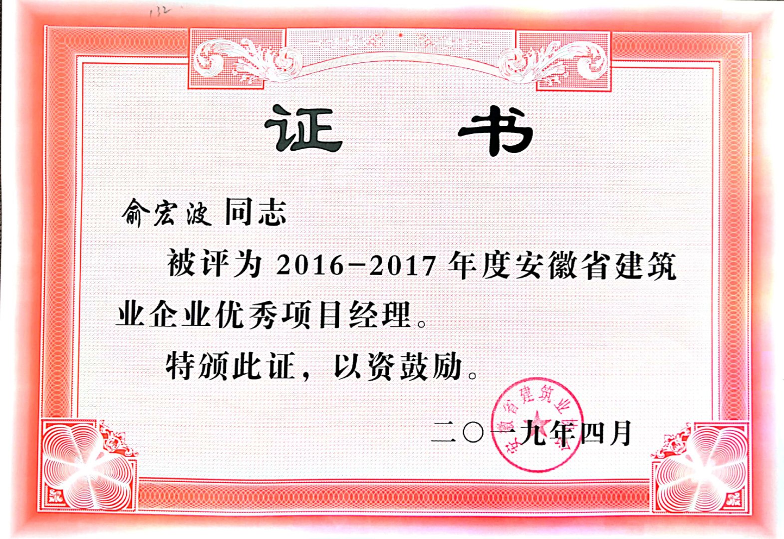 >2016-2017年安徽省建筑業(yè)優(yōu)秀項目經(jīng)理——俞宏波