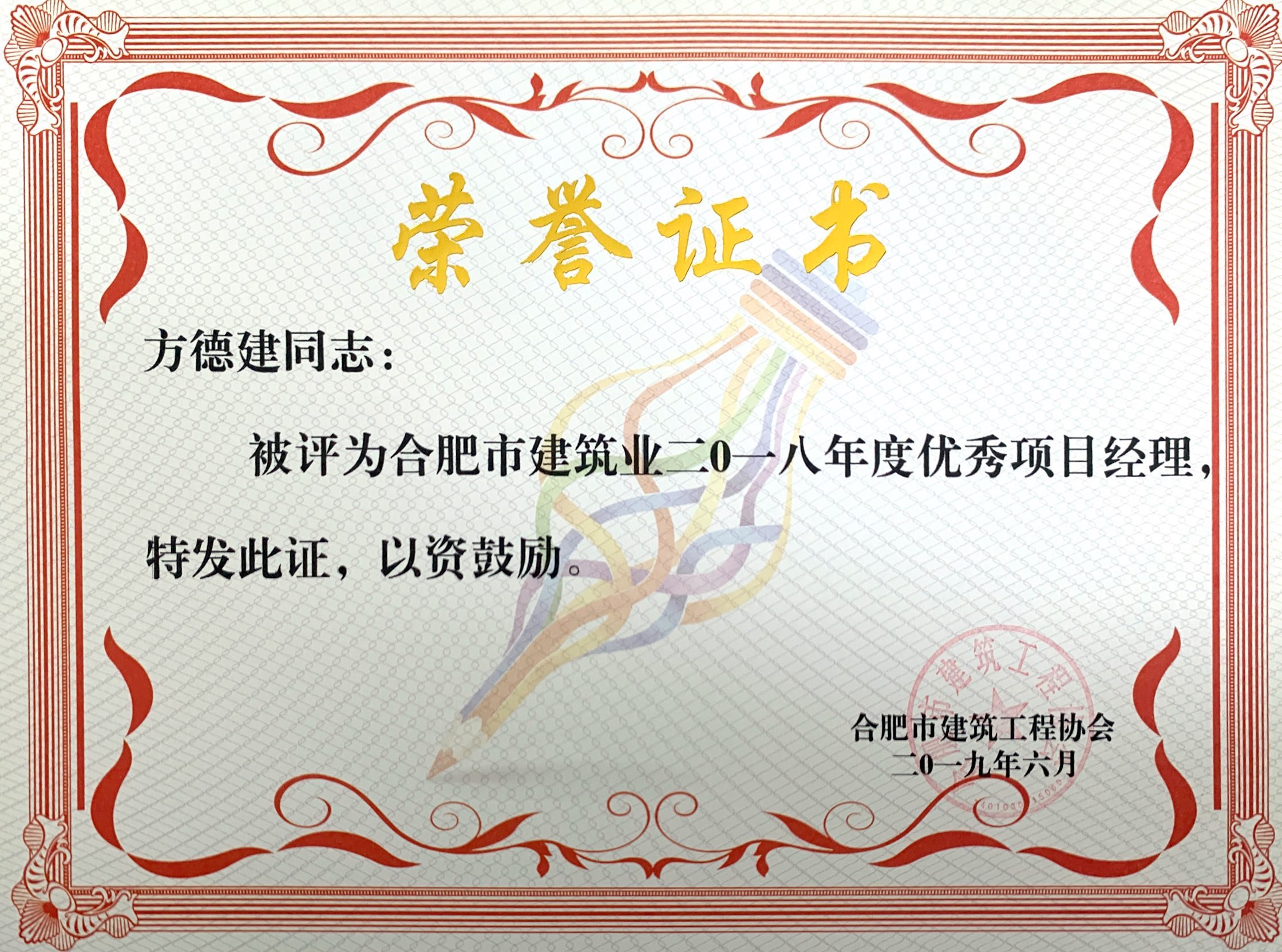 >合肥市建筑業2018年度優秀項目經理——方德建