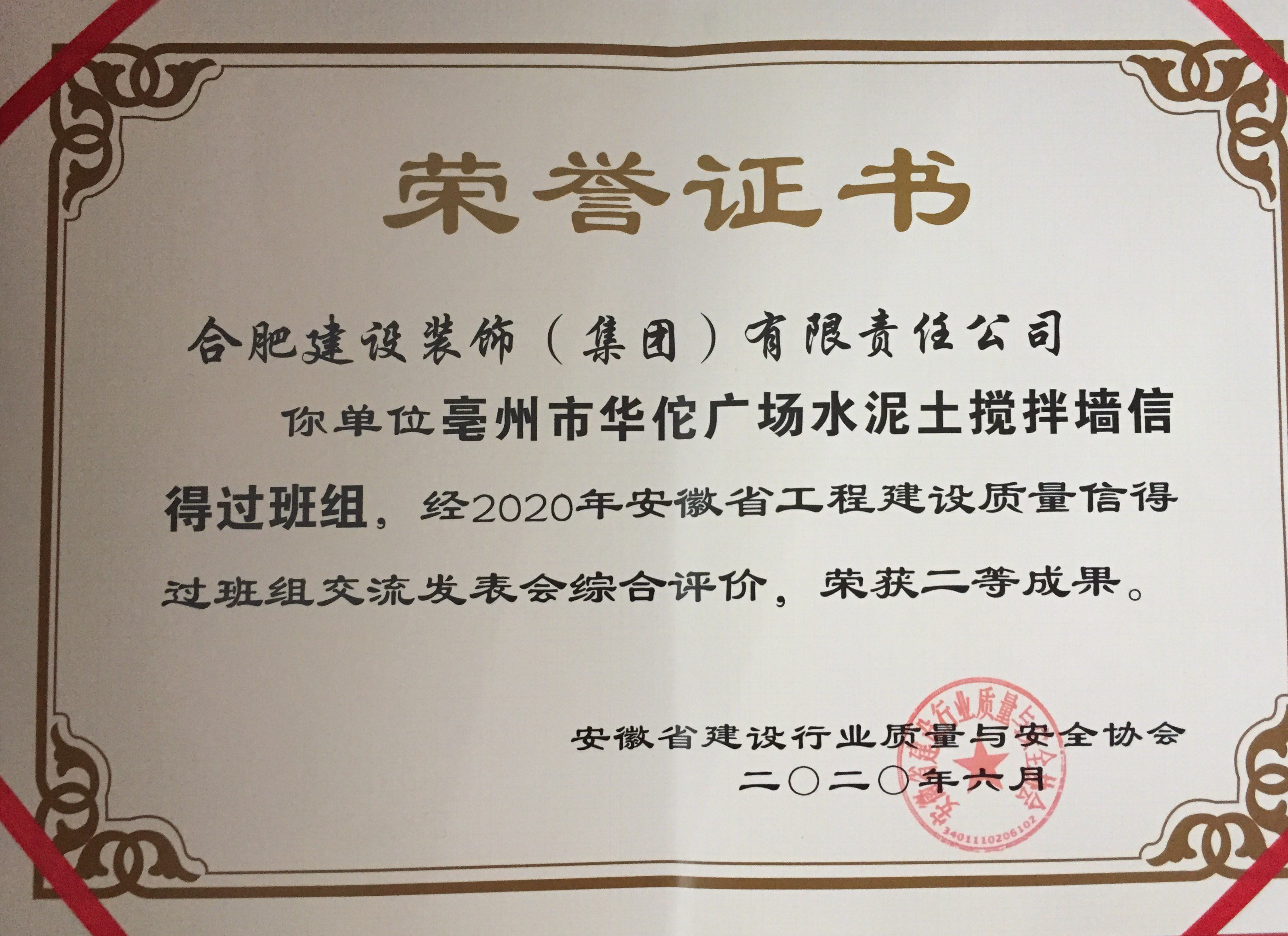 >亳州華佗廣場(chǎng)基礎(chǔ)工程QC小組《提高水泥土攪拌墻成墻質(zhì)量驗(yàn)收合格率》成果榮獲2020年安徽省工程建設(shè)質(zhì)量管理小組成果一等獎(jiǎng)