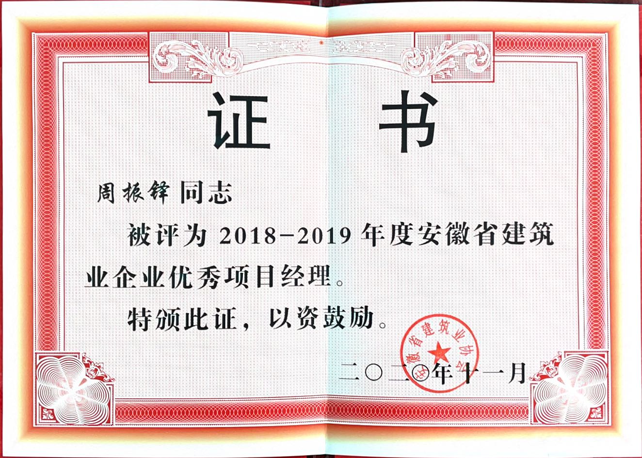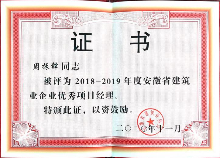 >2020年安徽省建筑業(yè)企業(yè)優(yōu)秀項目經(jīng)理--周振鐸