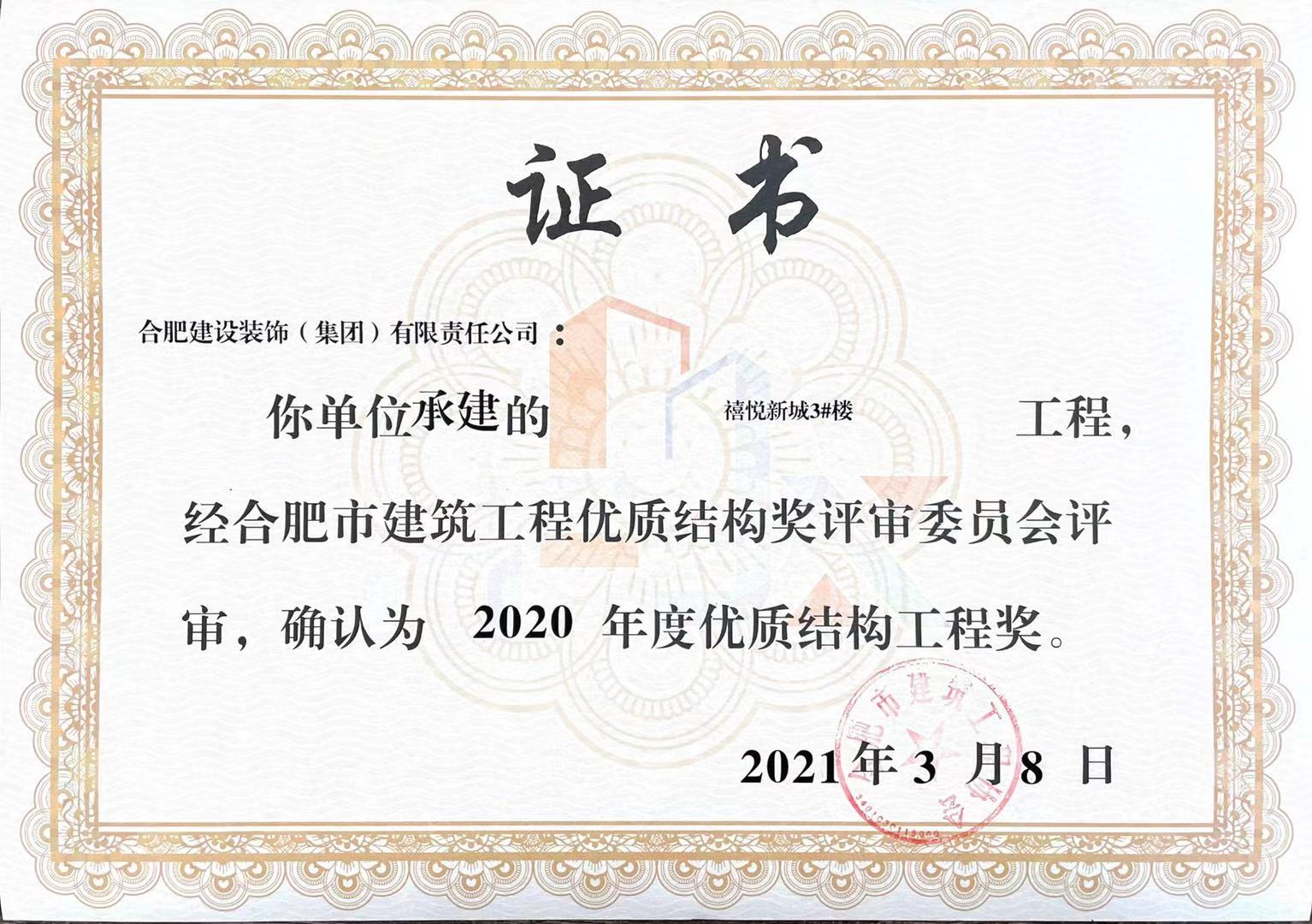 >禧悅新城3#樓——2020年度合肥市建筑工程優(yōu)質(zhì)結(jié)構(gòu)獎