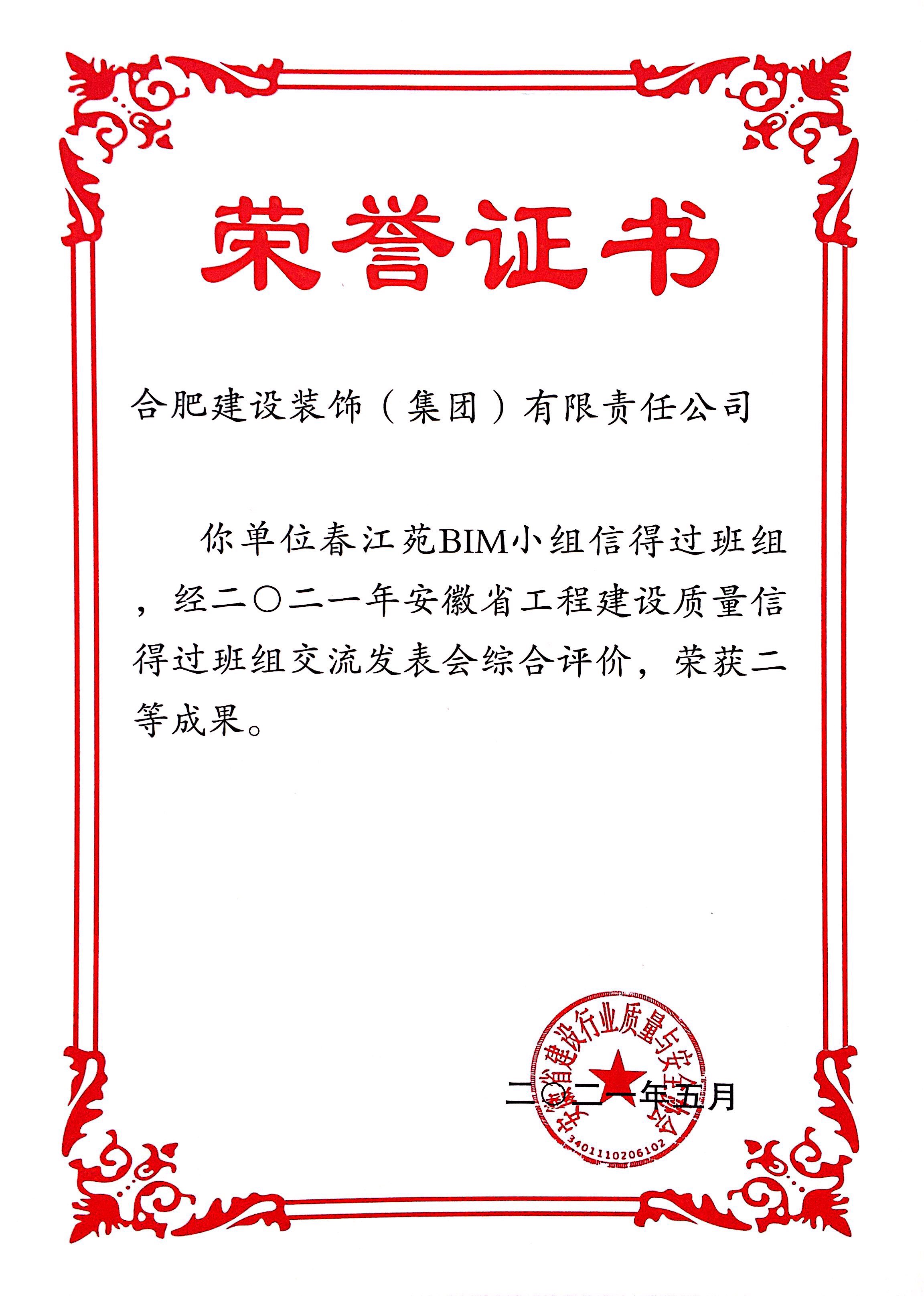 >春江苑BIM小組信得過班組 2021年安徽省工程建設質量信得過班組交流會綜合評價二等成果