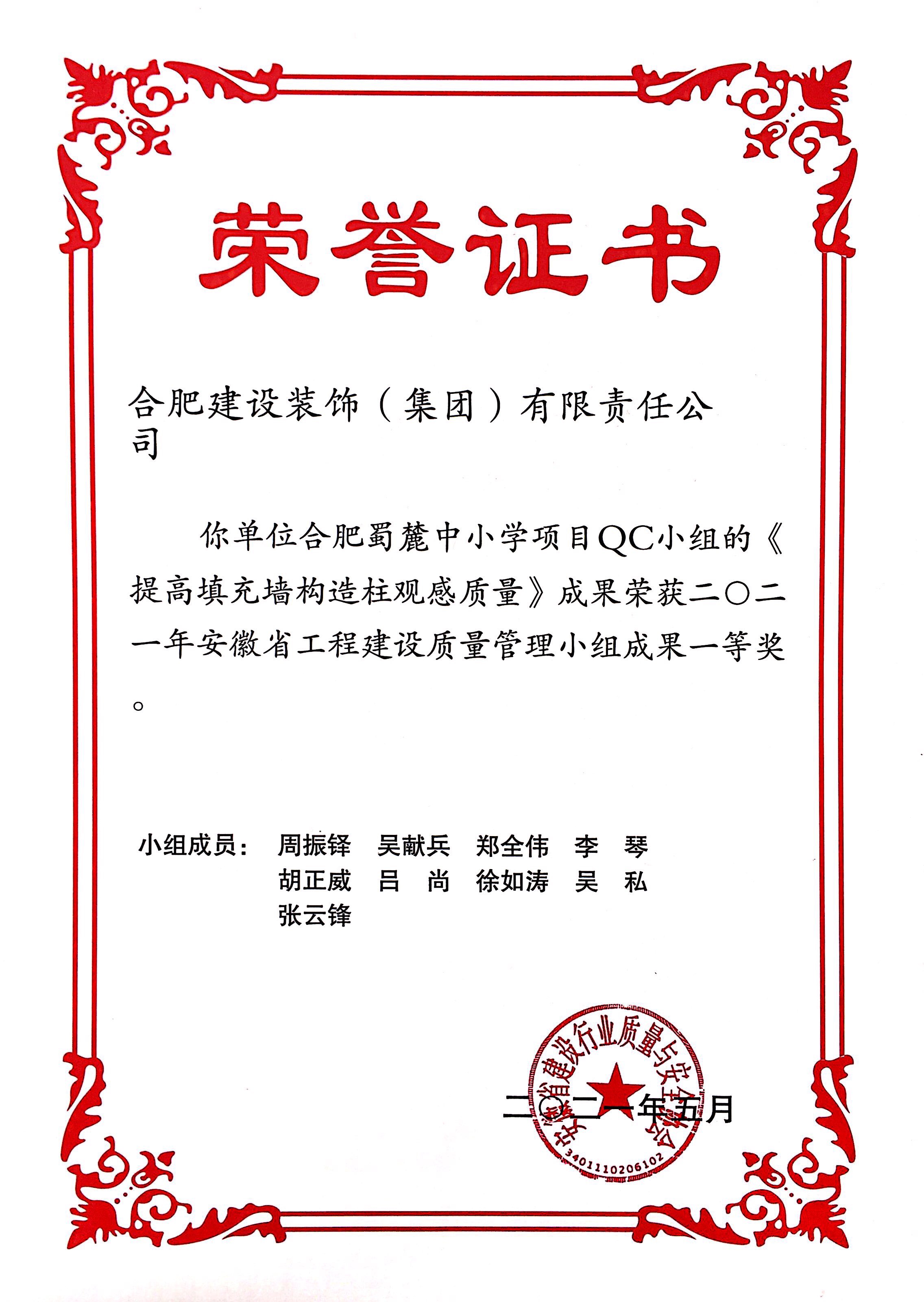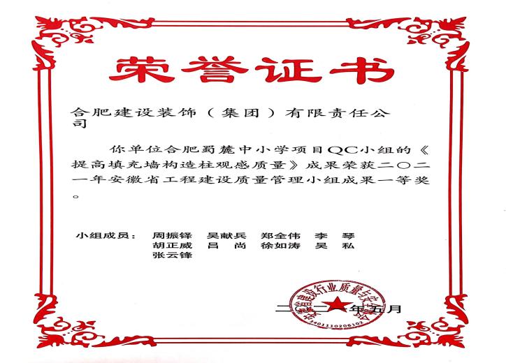 >合肥蜀麓中小學(xué)項目QC小組《提高填充墻充構(gòu)造柱觀感質(zhì)量》——2021年安徽省工程建設(shè)質(zhì)量管理小組一等獎