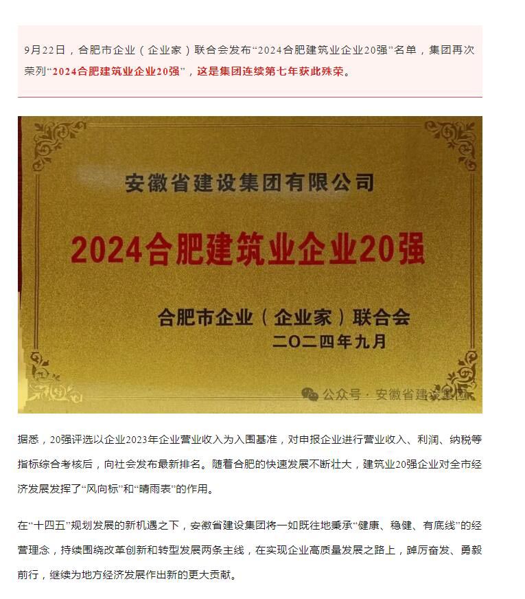 >集團(tuán)連續(xù)七年榮登“合肥建筑業(yè)企業(yè)20強(qiáng)”榜單